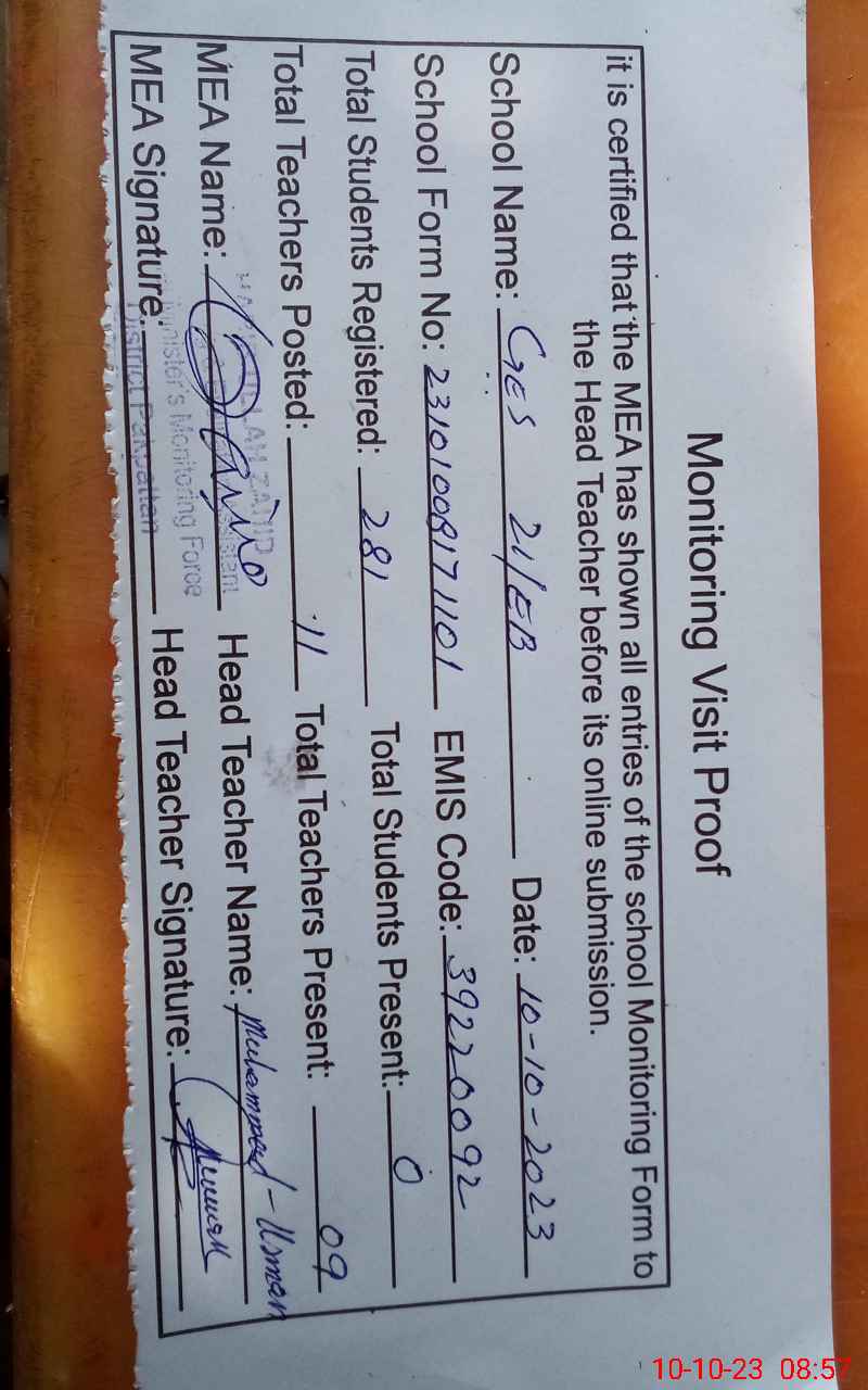 | Remarks (Use Separate Page if Required): Note school boundary wall fallen nonfunctional approximately 800rft 1 Teacher Sardar Ali EST 2 Teacher Shehzad Ahmed EST both found UN AUTHORIZED ABSENT | |||||