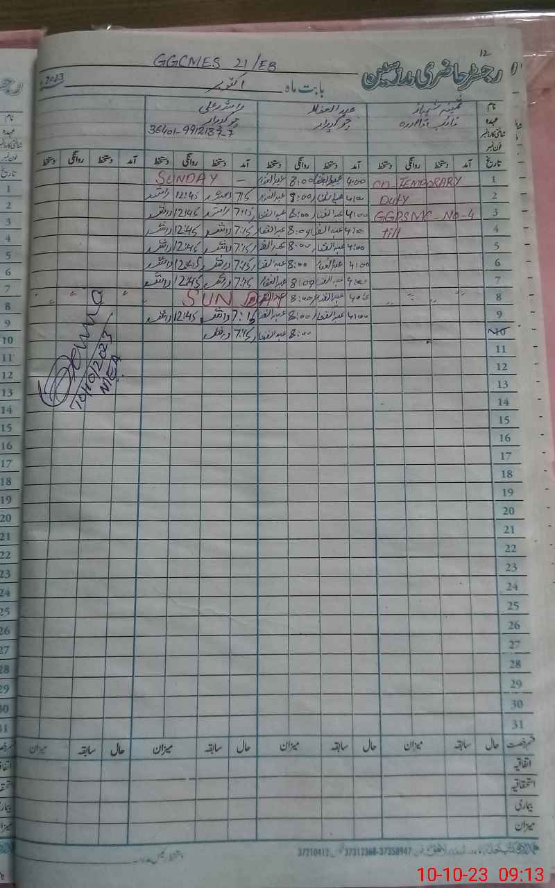 | Name: FA**** SH**** Designation: (School Headmaster's/Headmistress's) SST (GENERAL) Phone/Cell Number: 03**** |