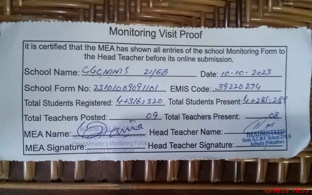 | Certified that this School was Inspected by the Undersigned MEA/DMO Today and the Information Stated Above is as Per Record. | |||||