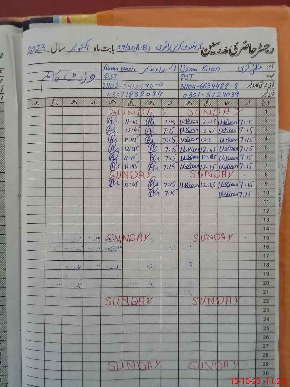 | Name: Uz**** Ki**** Designation: (School Headmaster's/Headmistress's) PST Phone/Cell Number: 03**** |