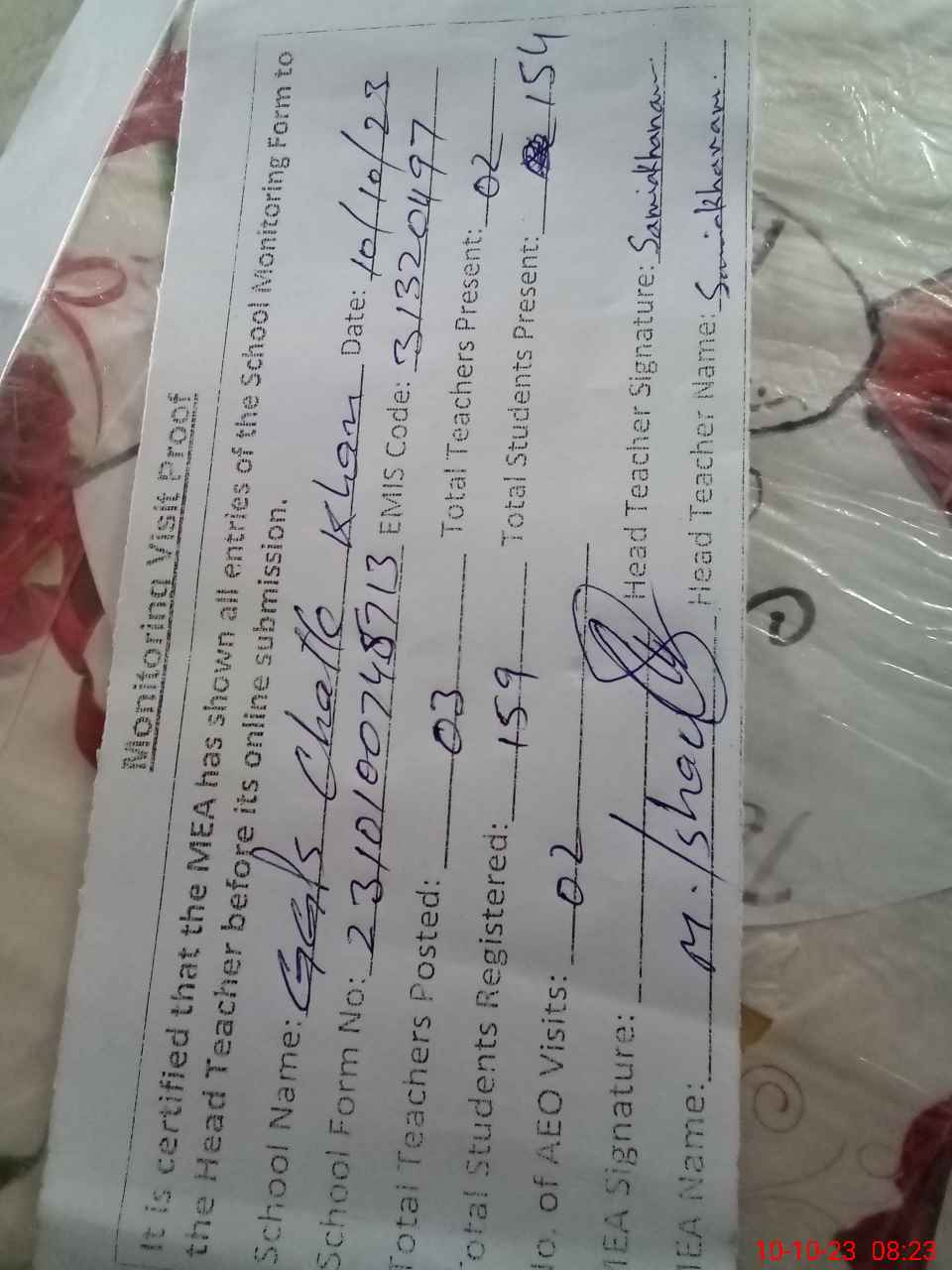 | Attendance Register | Head Teacher | MEA with School | Visit Proof |