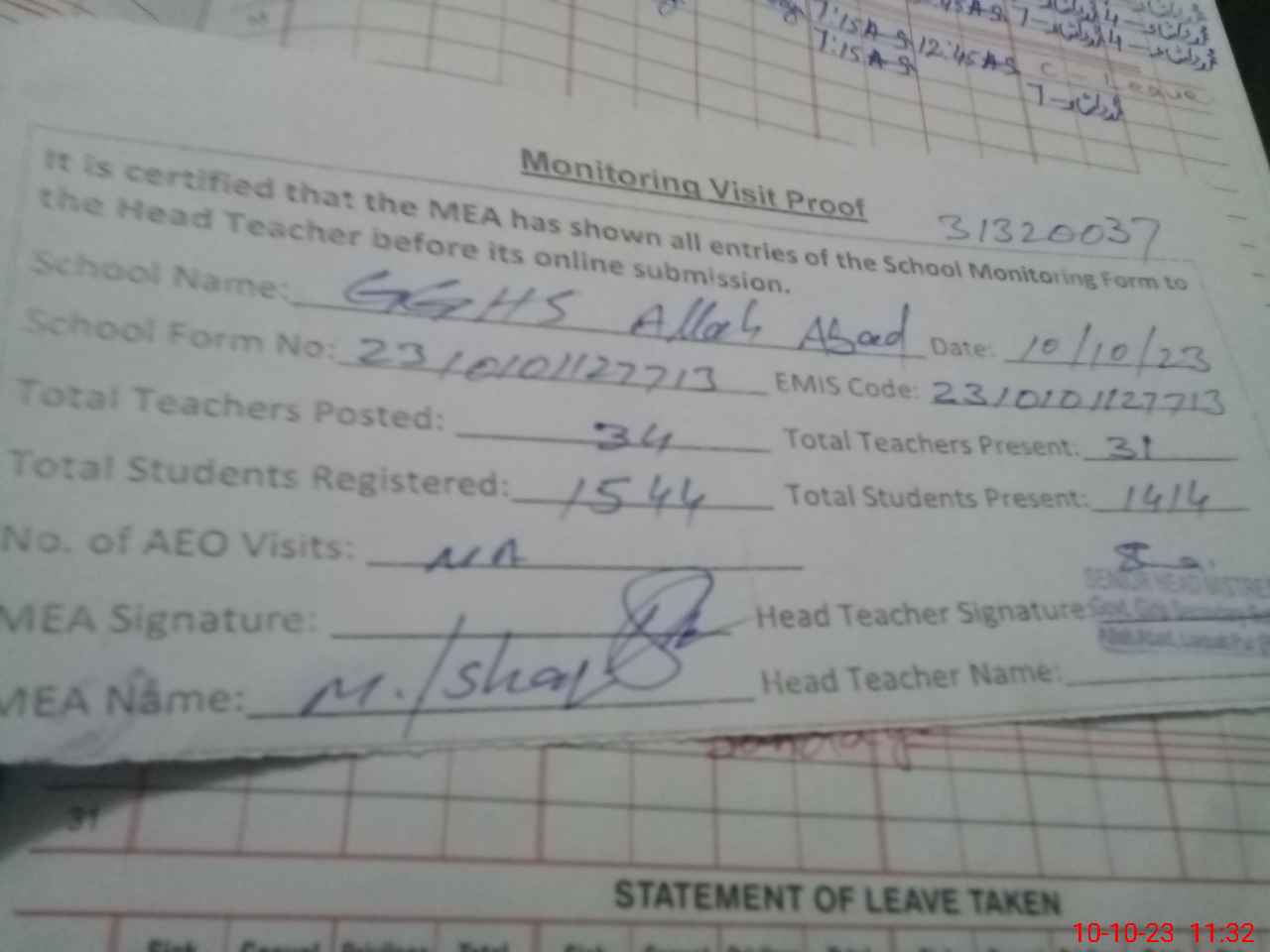 | EMIS Code: 31320037 | Name of School: GGHS ALLAH ABAD | |||