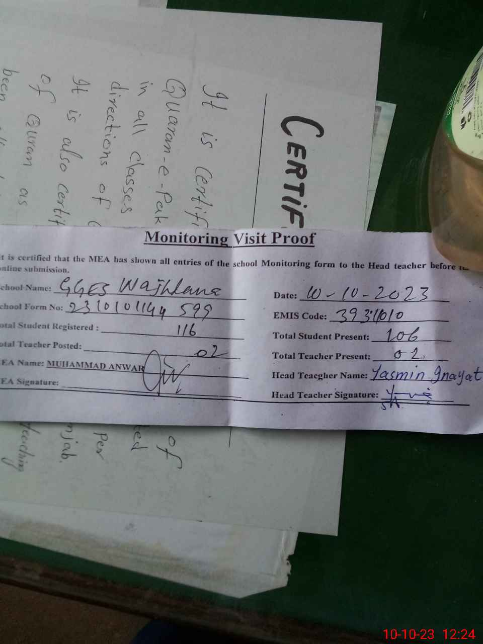 | Certified that this School was Inspected by the Undersigned MEA/DMO Today and the Information Stated Above is as Per Record. | |||||