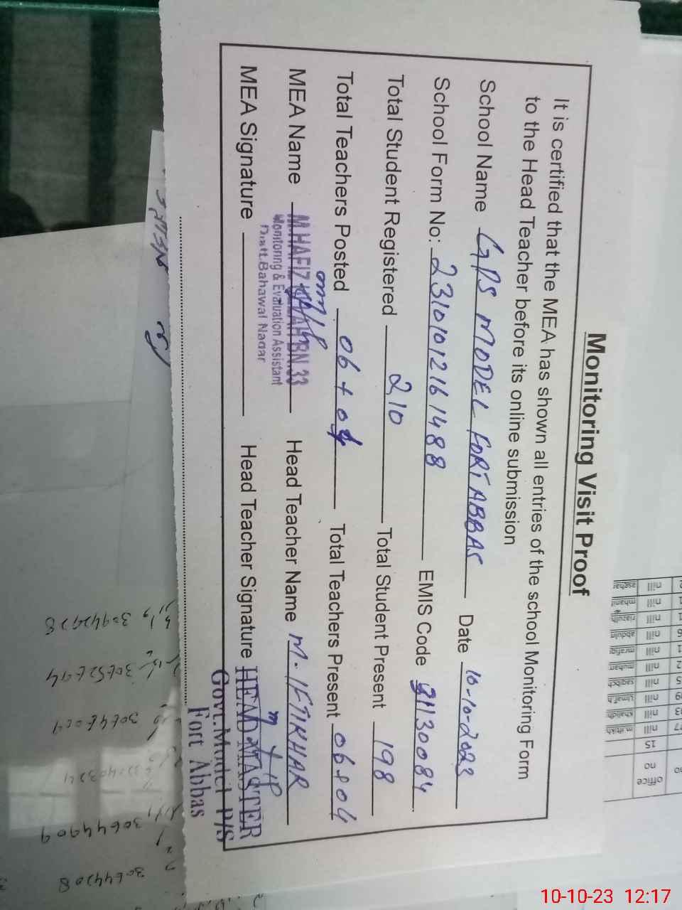 | Attendance Register | Head Teacher | MEA with School | Visit Proof |