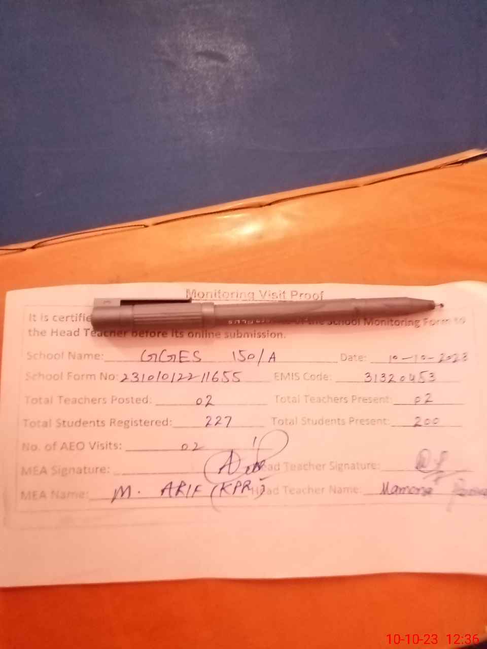 | Attendance Register | Head Teacher | MEA with School | Visit Proof |