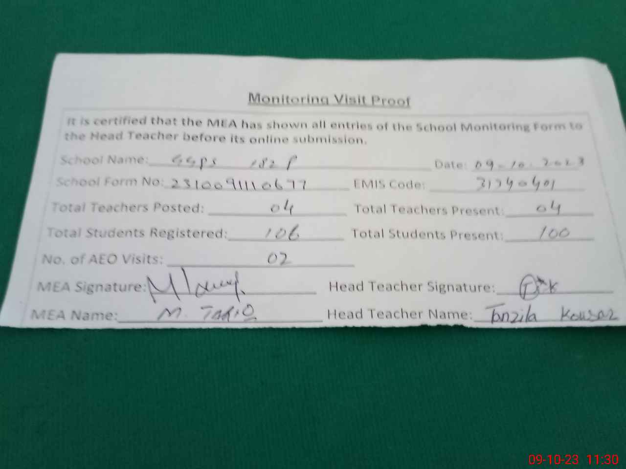 | Attendance Register | Head Teacher | MEA with School | Visit Proof |