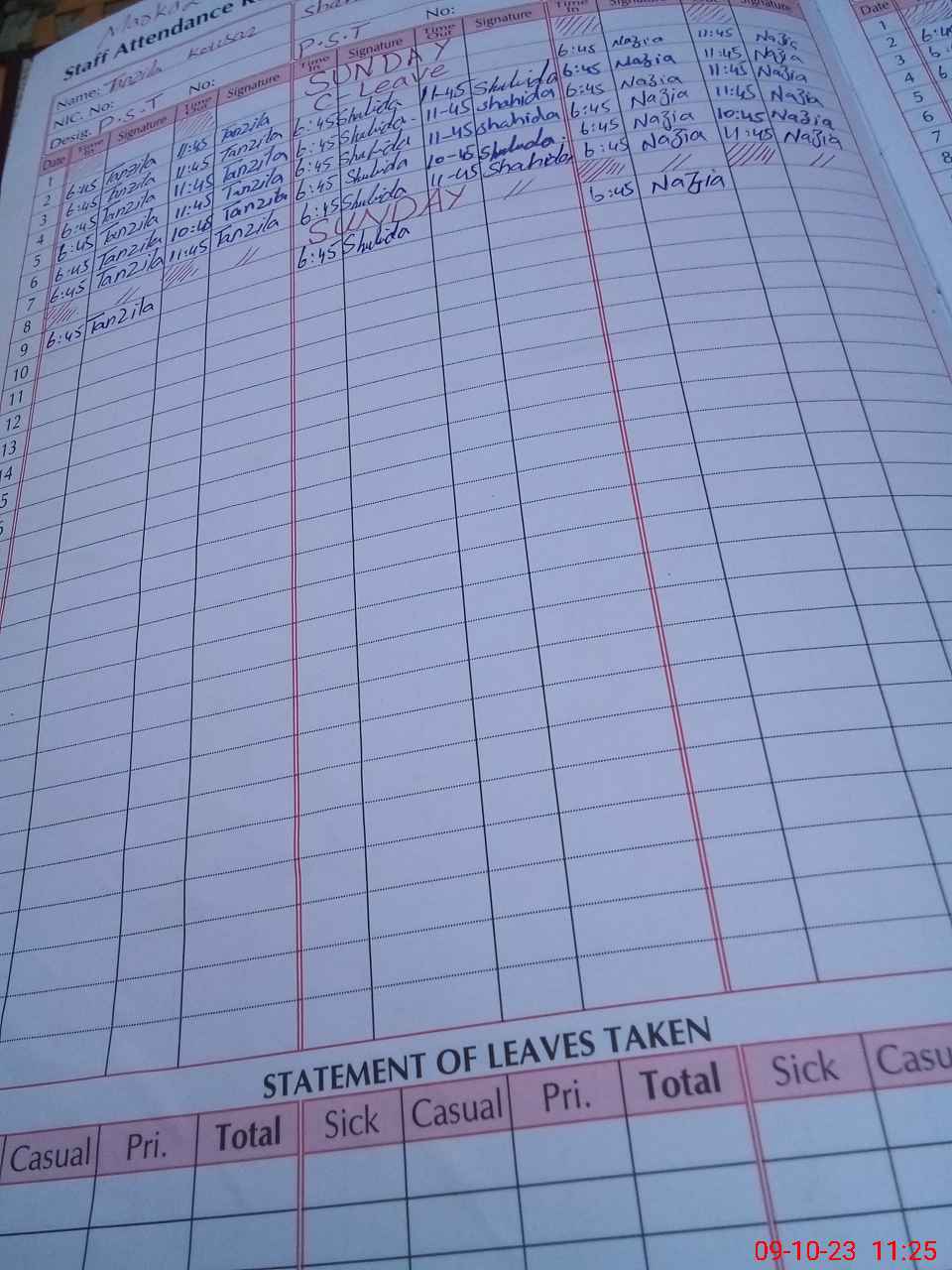 | CNIC | Full Name | Designation | R/C | Absence During Last Calender Month |