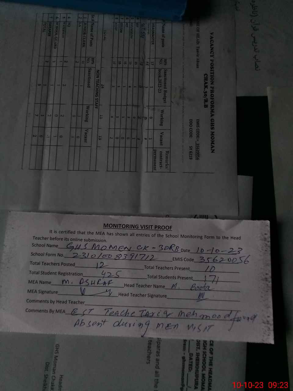 | Remarks (Use Separate Page if Required): Est teacher Tariq Mehmood found absent during MEA visit | |||||