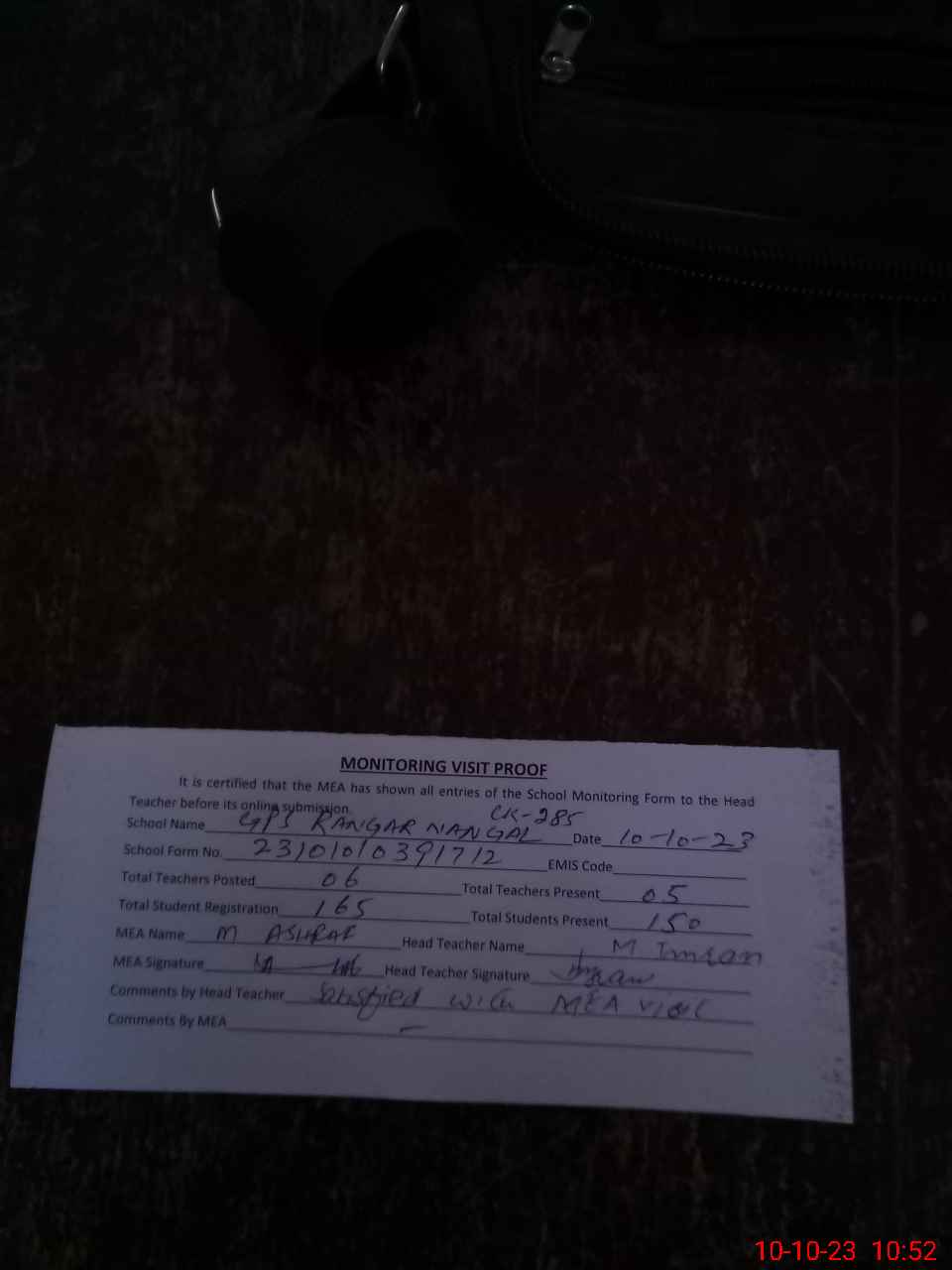 | Monitoring Date: 10-10-2023 | Start Time: 10-10-2023 10:26 AM | End Time: 10-10-2023 11:00 AM | Name of MEA: Mu**** As**** | |