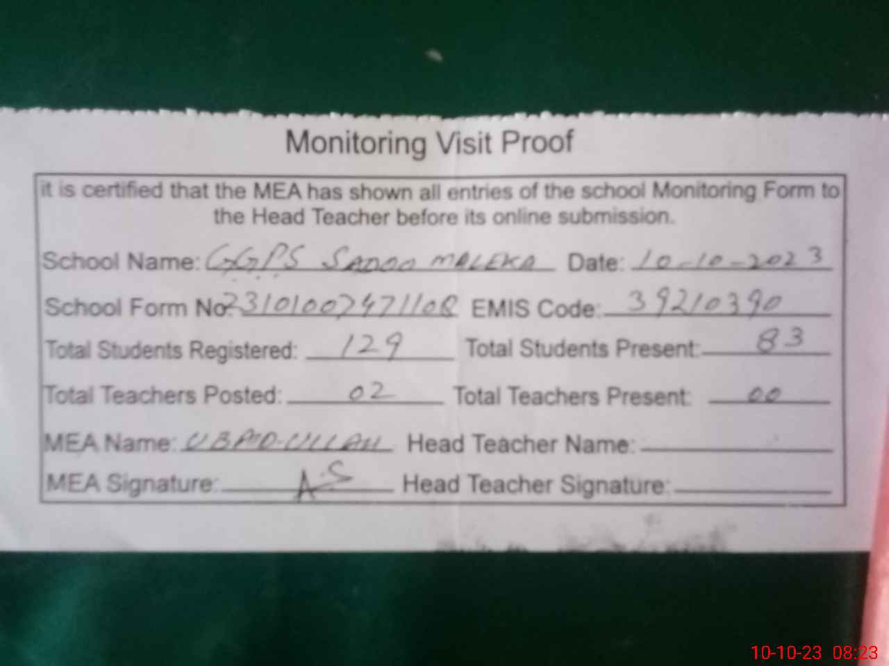 | Attendance Register | Head Teacher | MEA with School | Visit Proof |