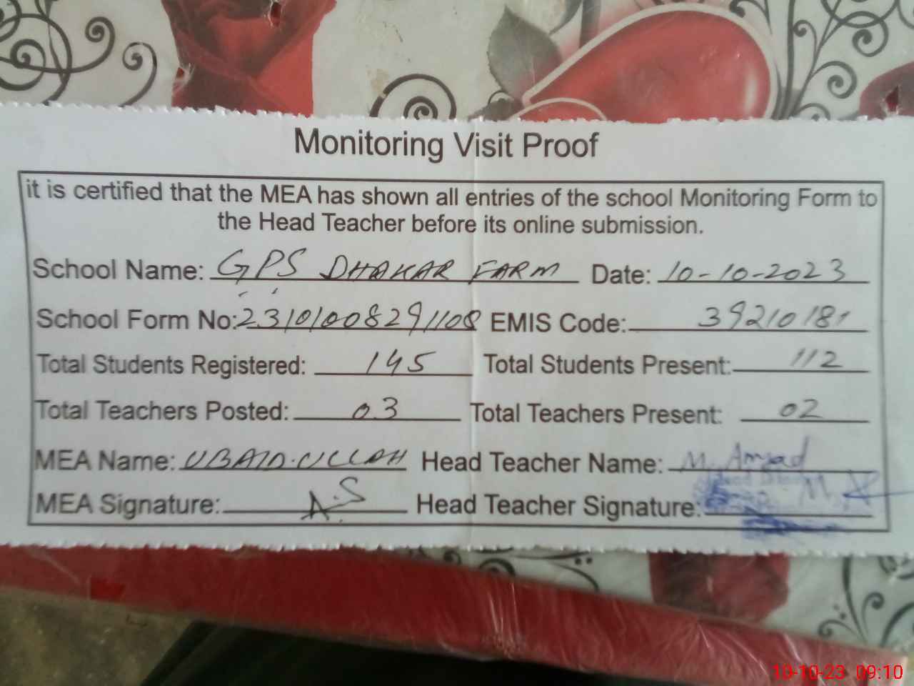 | Attendance Register | Head Teacher | MEA with School | Visit Proof |