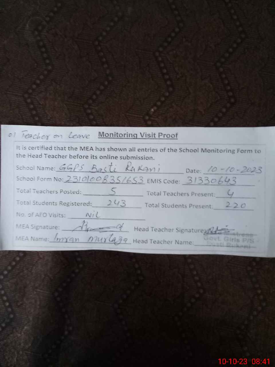 | Certified that this School was Inspected by the Undersigned MEA/DMO Today and the Information Stated Above is as Per Record. | |||||