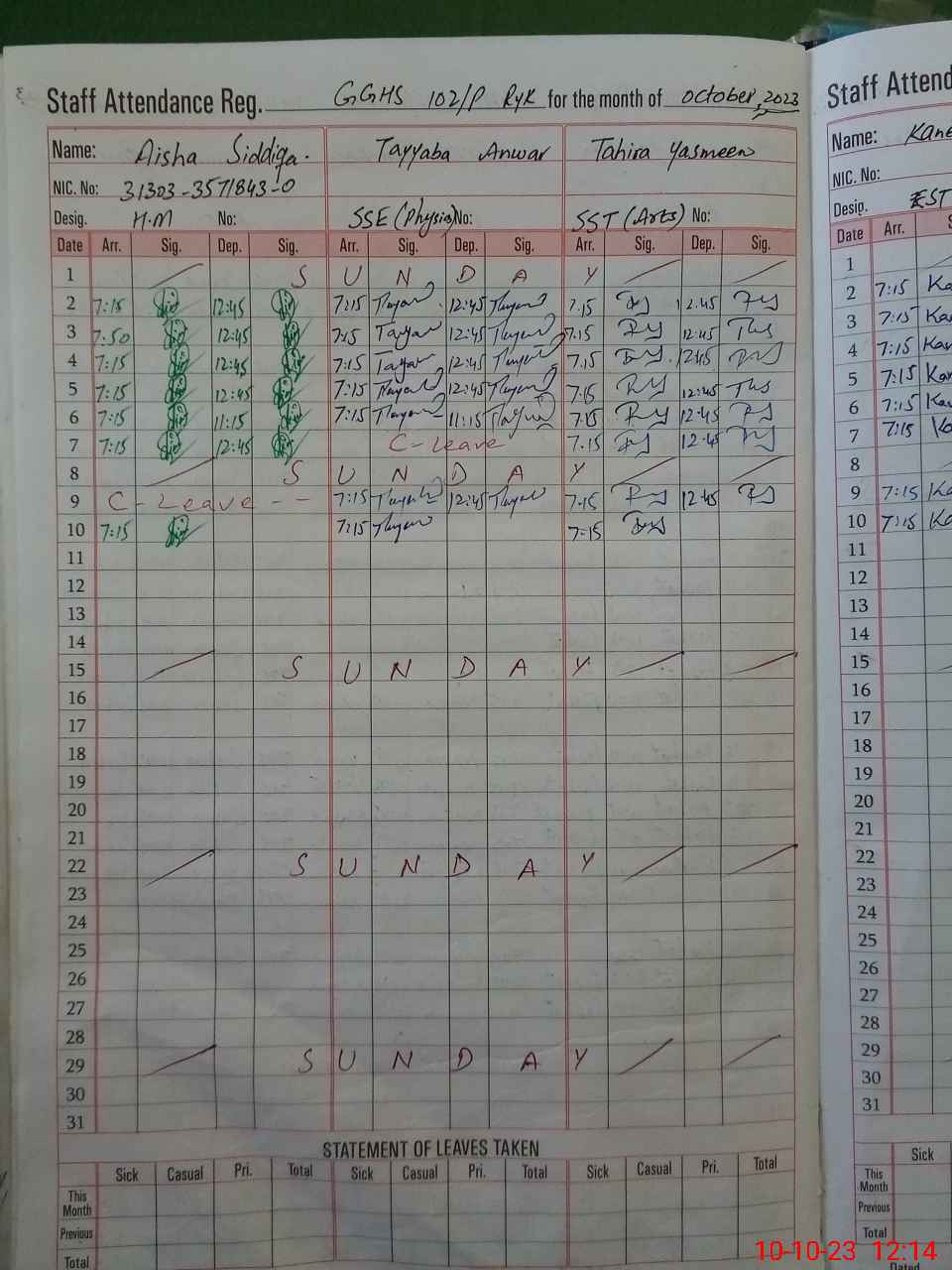 | CNIC | Full Name | Designation | R/C | Absence During Last Calender Month |