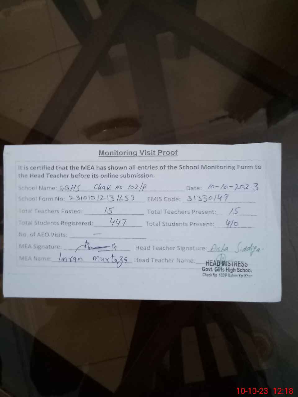 | Attendance Register | Head Teacher | MEA with School | Visit Proof |