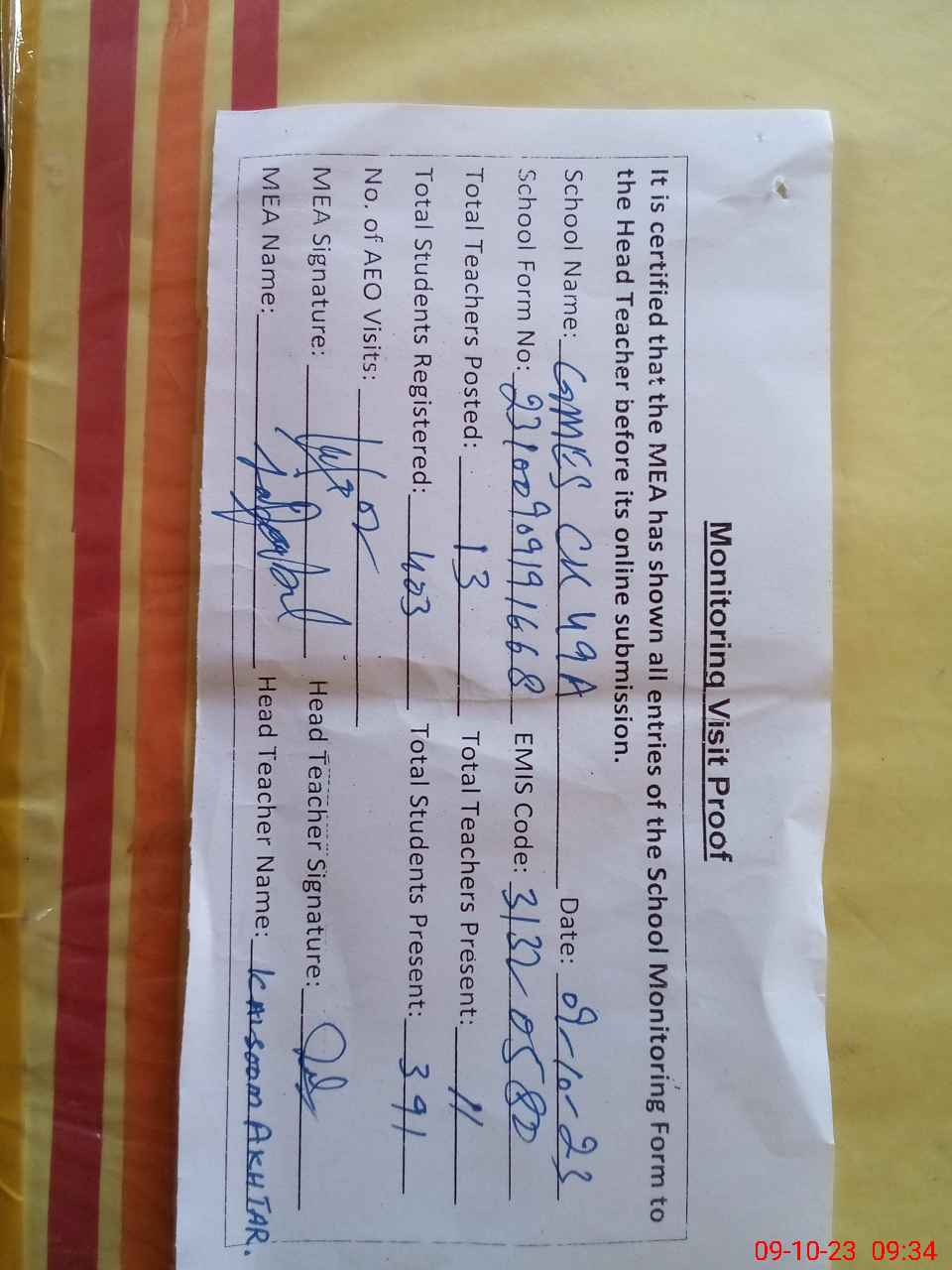 | Attendance Register | Head Teacher | MEA with School | Visit Proof |