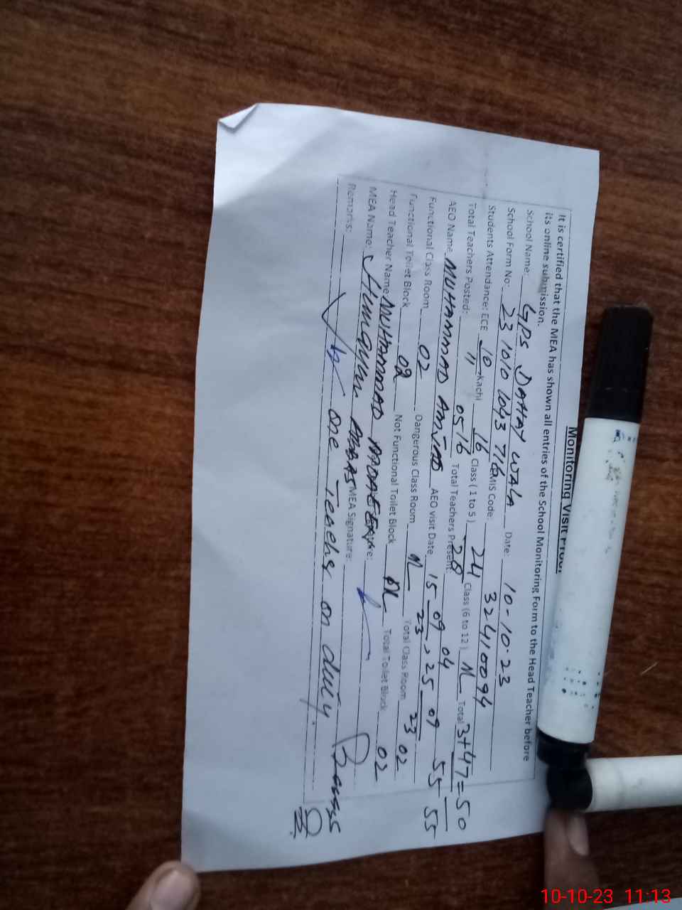 | Certified that this School was Inspected by the Undersigned MEA/DMO Today and the Information Stated Above is as Per Record. | |||||