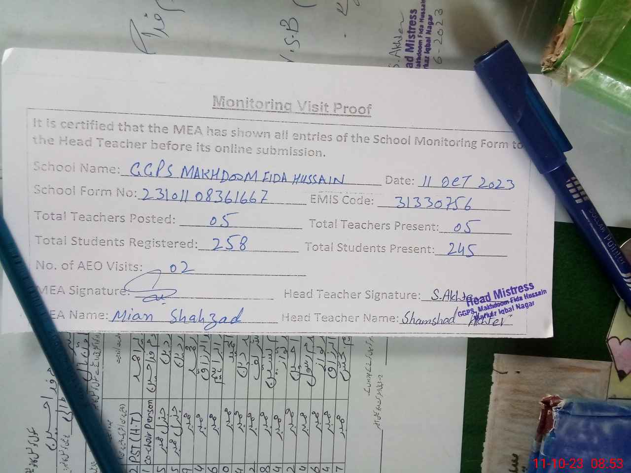 | Attendance Register | Head Teacher | MEA with School | Visit Proof |