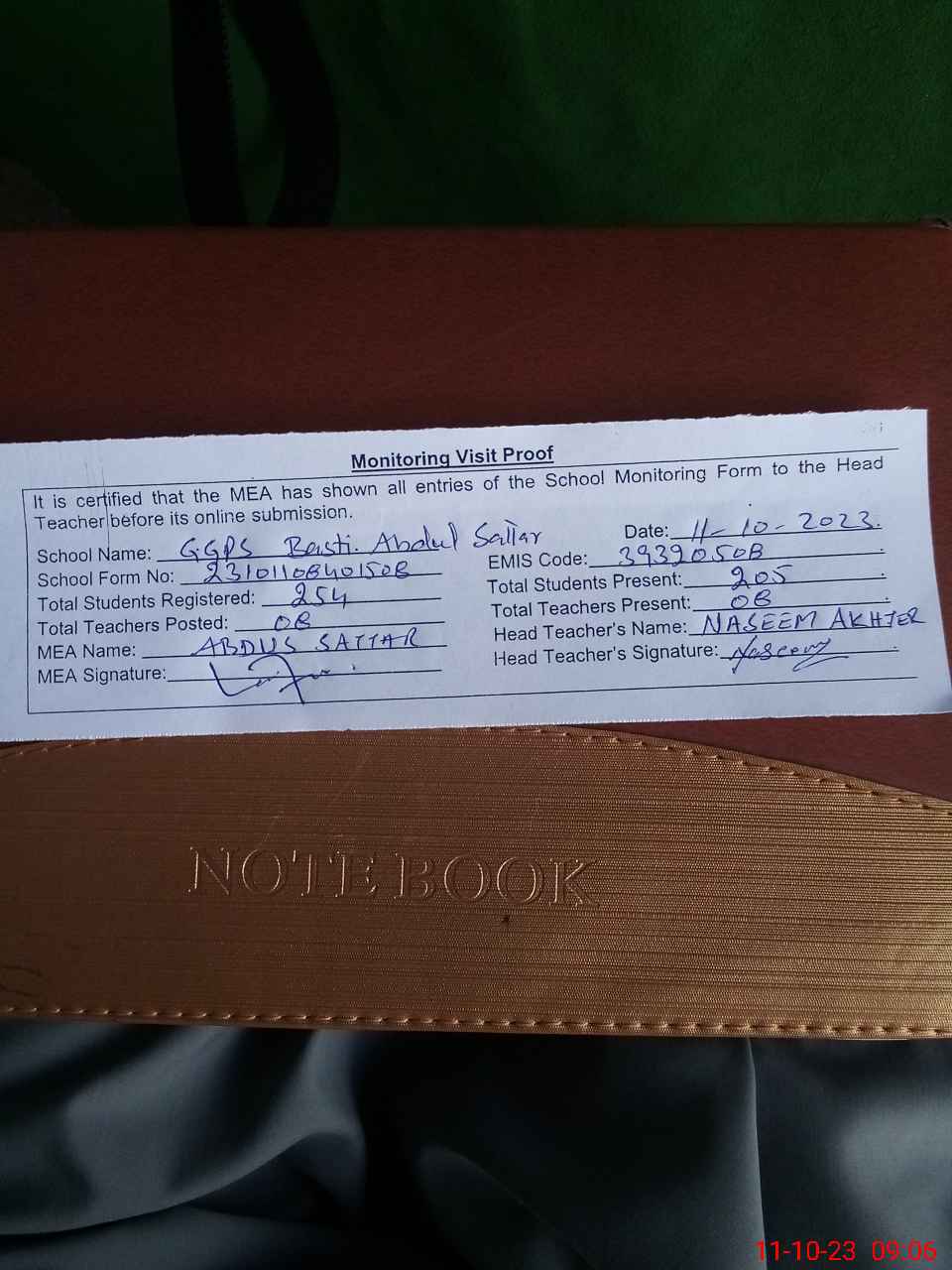 | Attendance Register | Head Teacher | MEA with School | Visit Proof |