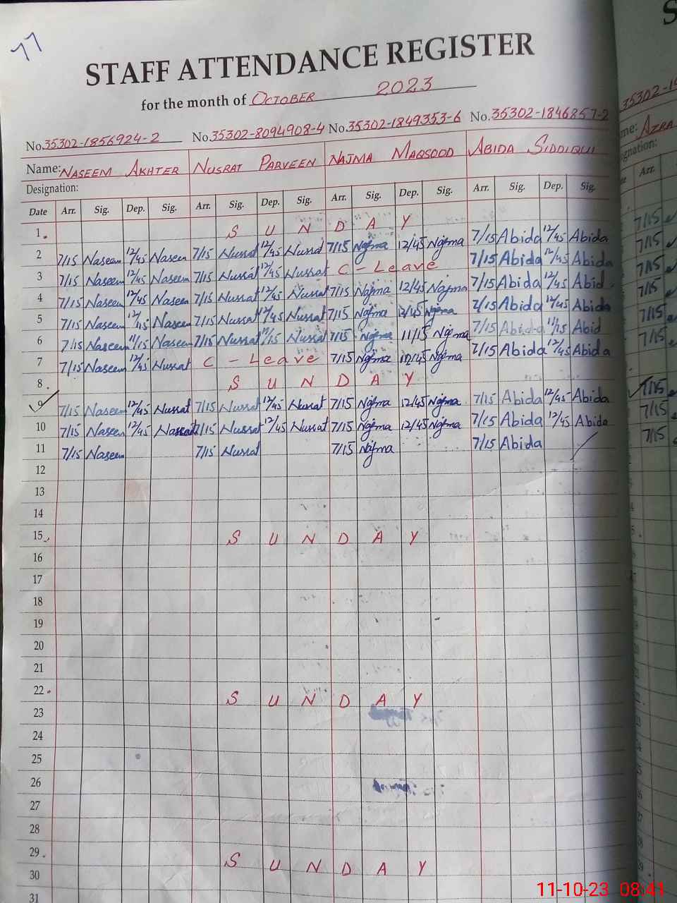 | CNIC | Full Name | Designation | R/C | Absence During Last Calender Month |