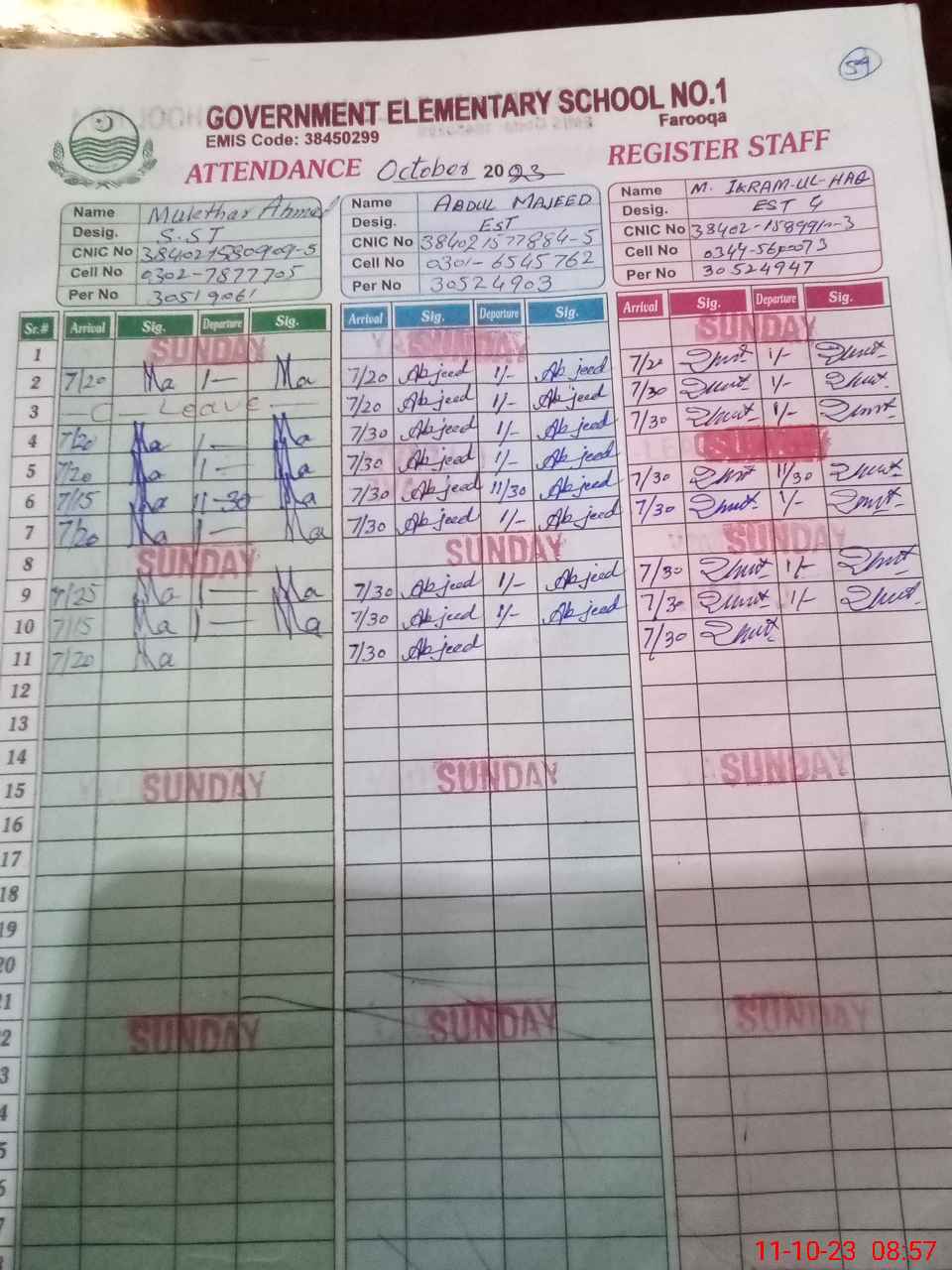 | Remarks (Use Separate Page if Required): Nasir Hayat PST attached on temporary duty GPS Mangla Basti from 09102023 for 89 days | |||||