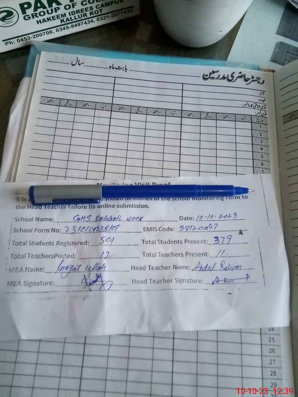 | Attendance Register | Head Teacher | MEA with School | Visit Proof |