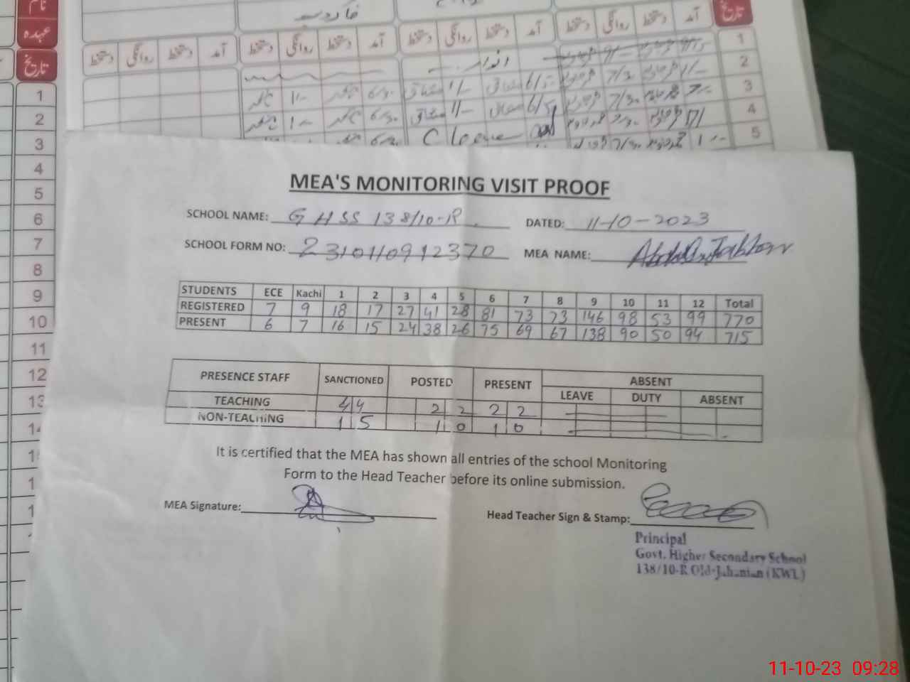 | Attendance Register | Head Teacher | MEA with School | Visit Proof |