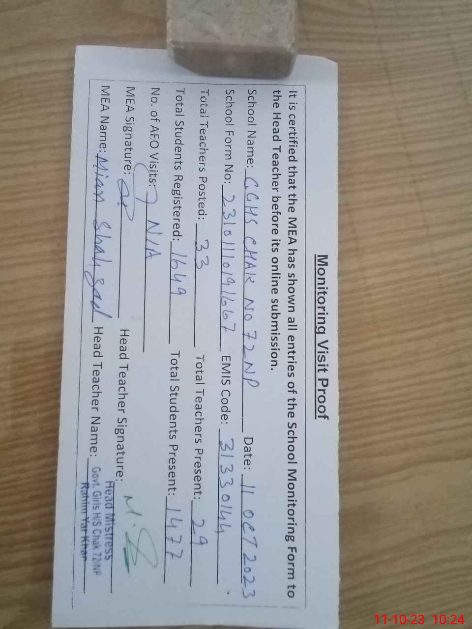 | EMIS Code: 31330144 | Name of School: GGHS CHAK NO. 72/NP | |||