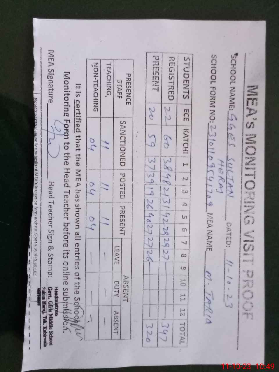 | Attendance Register | Head Teacher | MEA with School | Visit Proof |