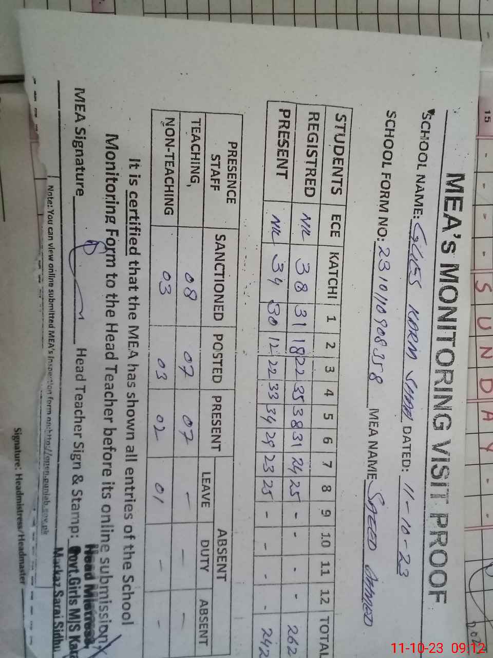 | Attendance Register | Head Teacher | MEA with School | Visit Proof |