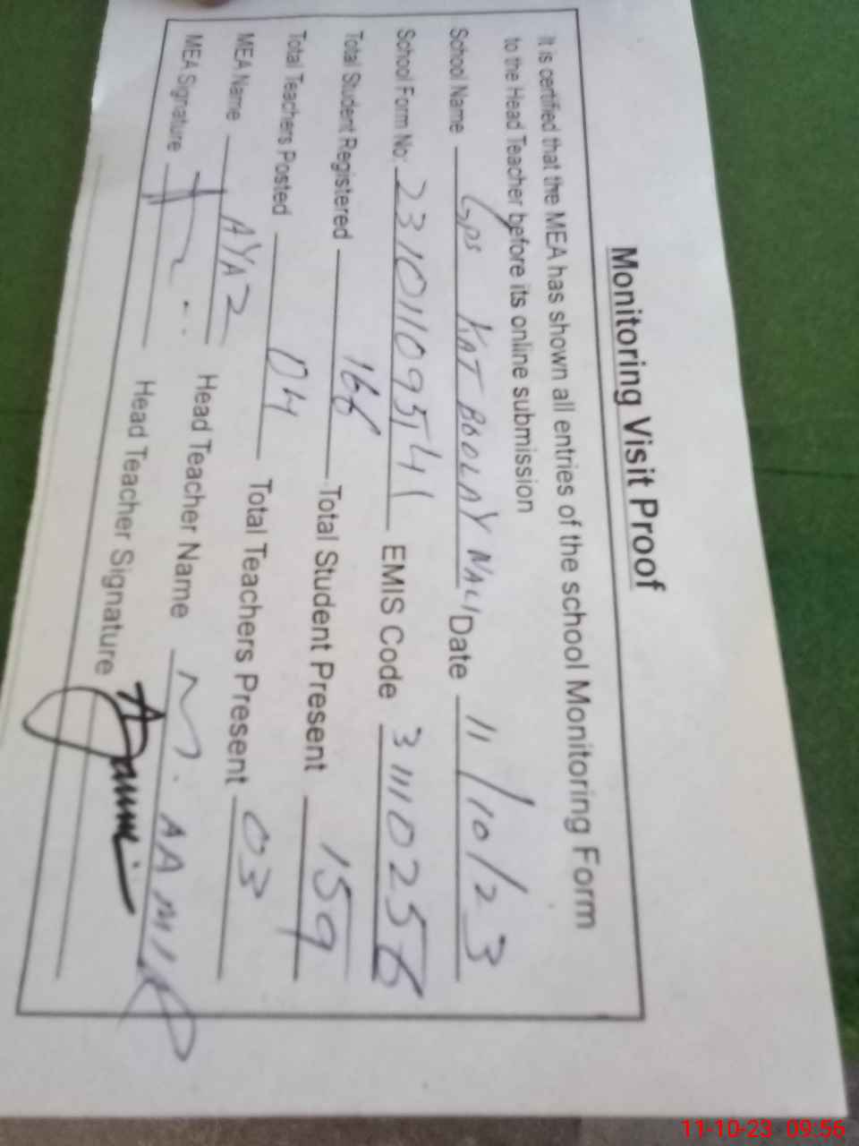 | Attendance Register | Head Teacher | MEA with School | Visit Proof |