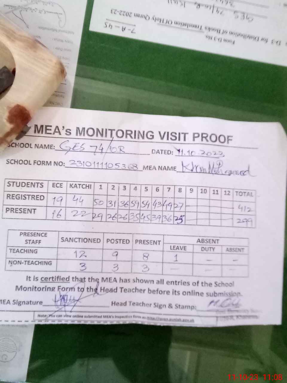 | Attendance Register | Head Teacher | MEA with School | Visit Proof |