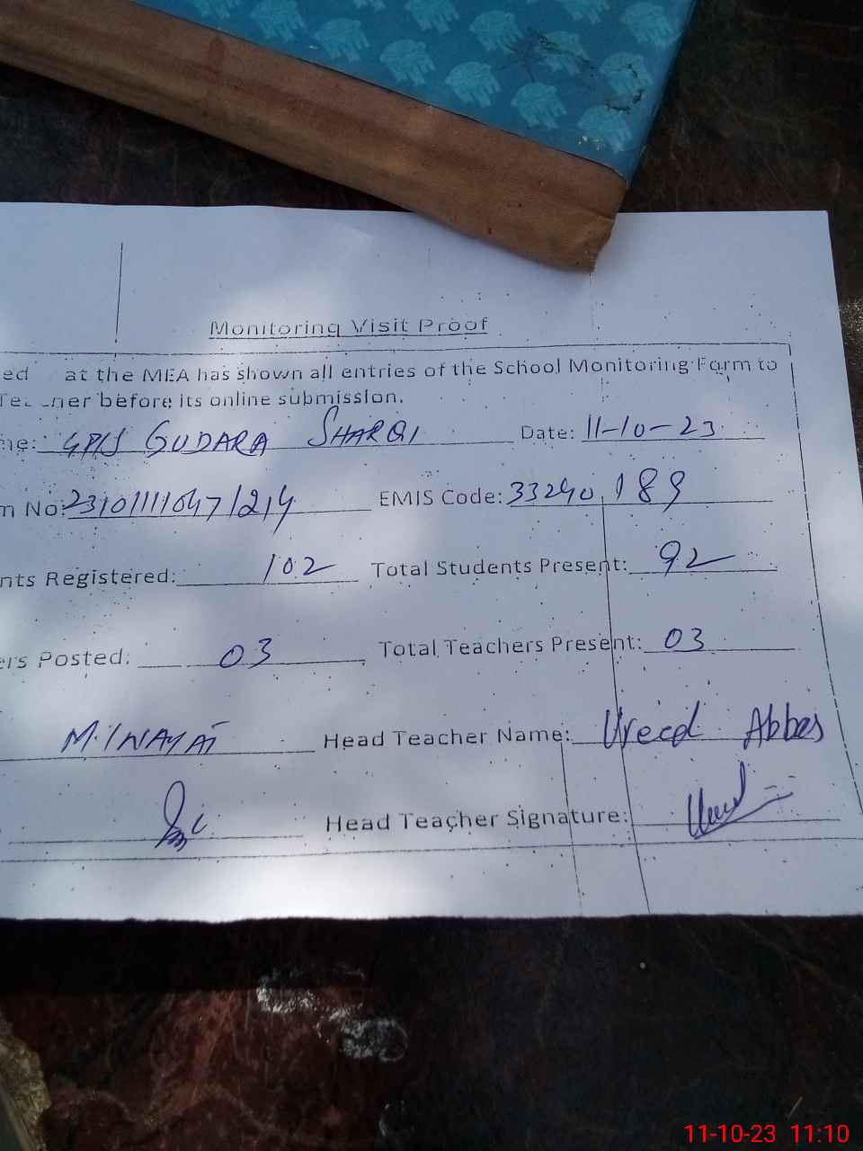 | Attendance Register | Head Teacher | MEA with School | Visit Proof |