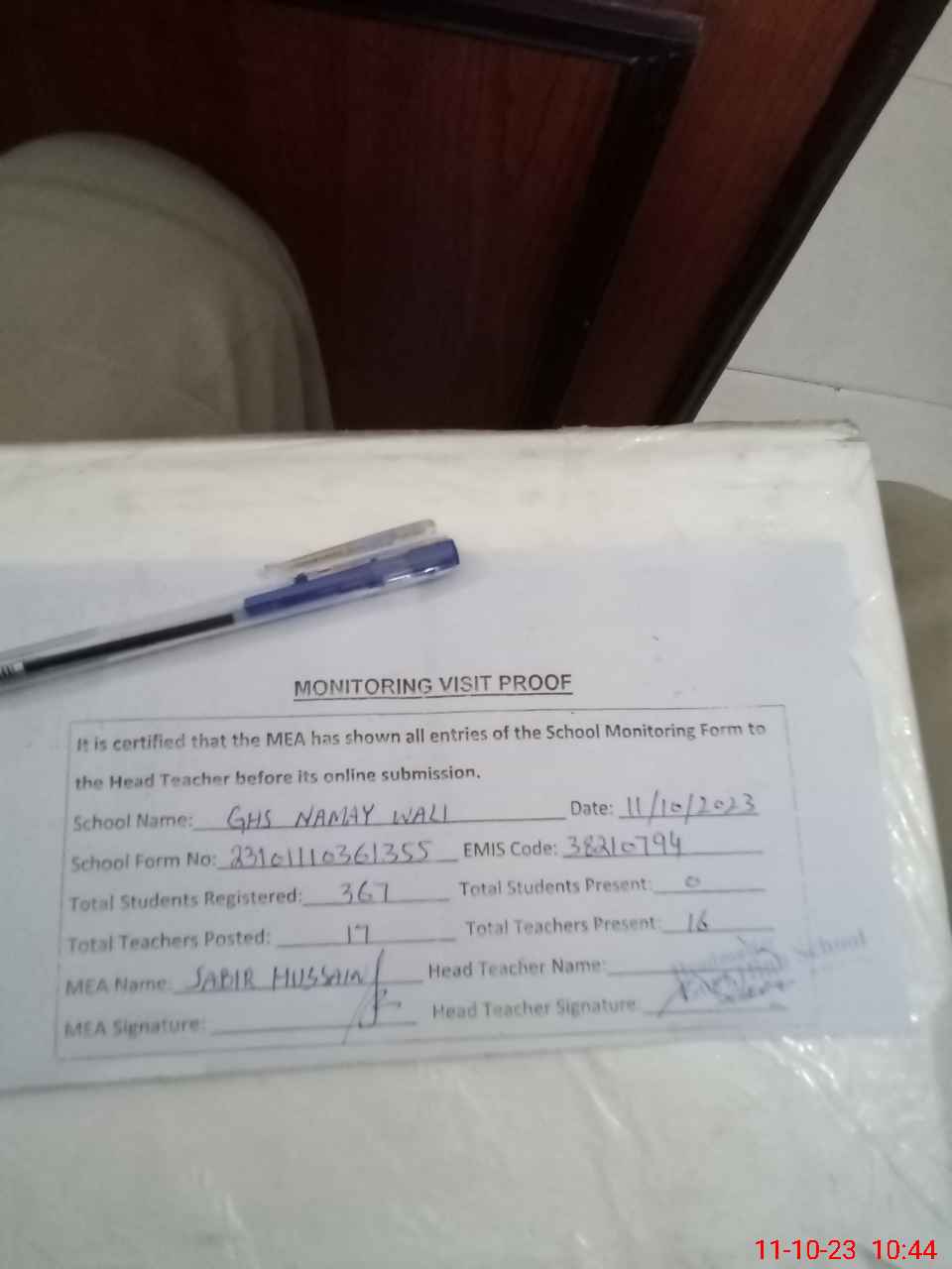 | EMIS Code: 38210794 | Name of School: GHS NAMAY WALI | |||