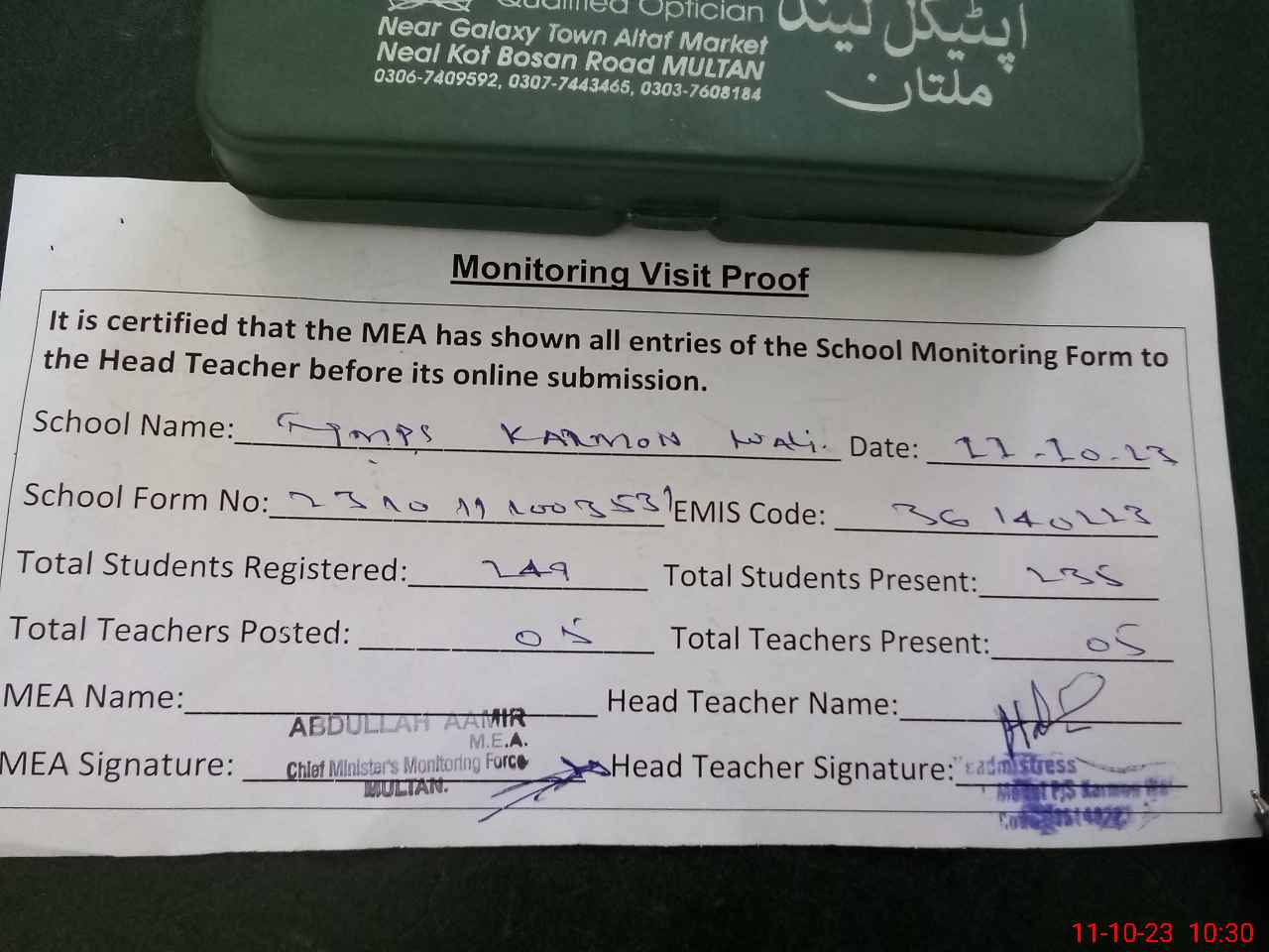 | Certified that this School was Inspected by the Undersigned MEA/DMO Today and the Information Stated Above is as Per Record. | |||||