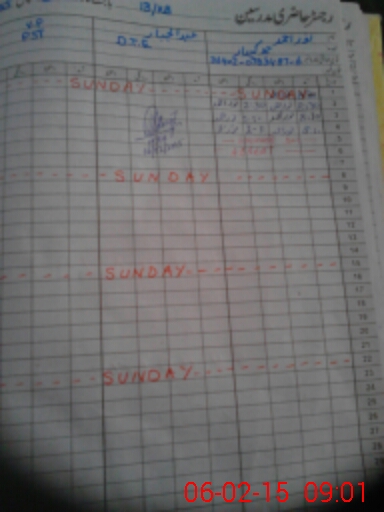 | CNIC | Full Name | Designation | R/C | Absence During Last Calender Month |