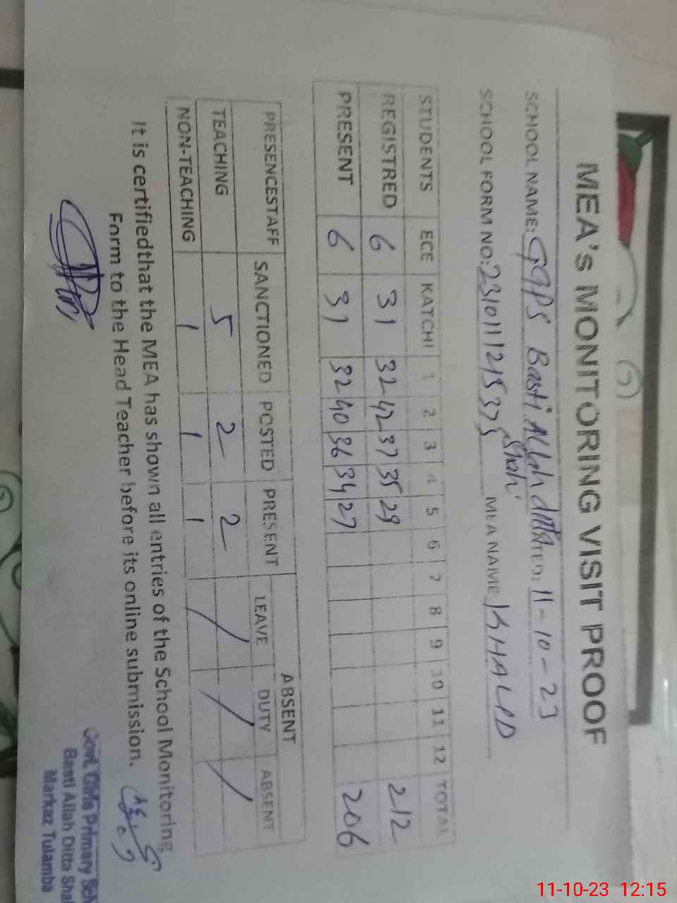 | Attendance Register | Head Teacher | MEA with School | Visit Proof |