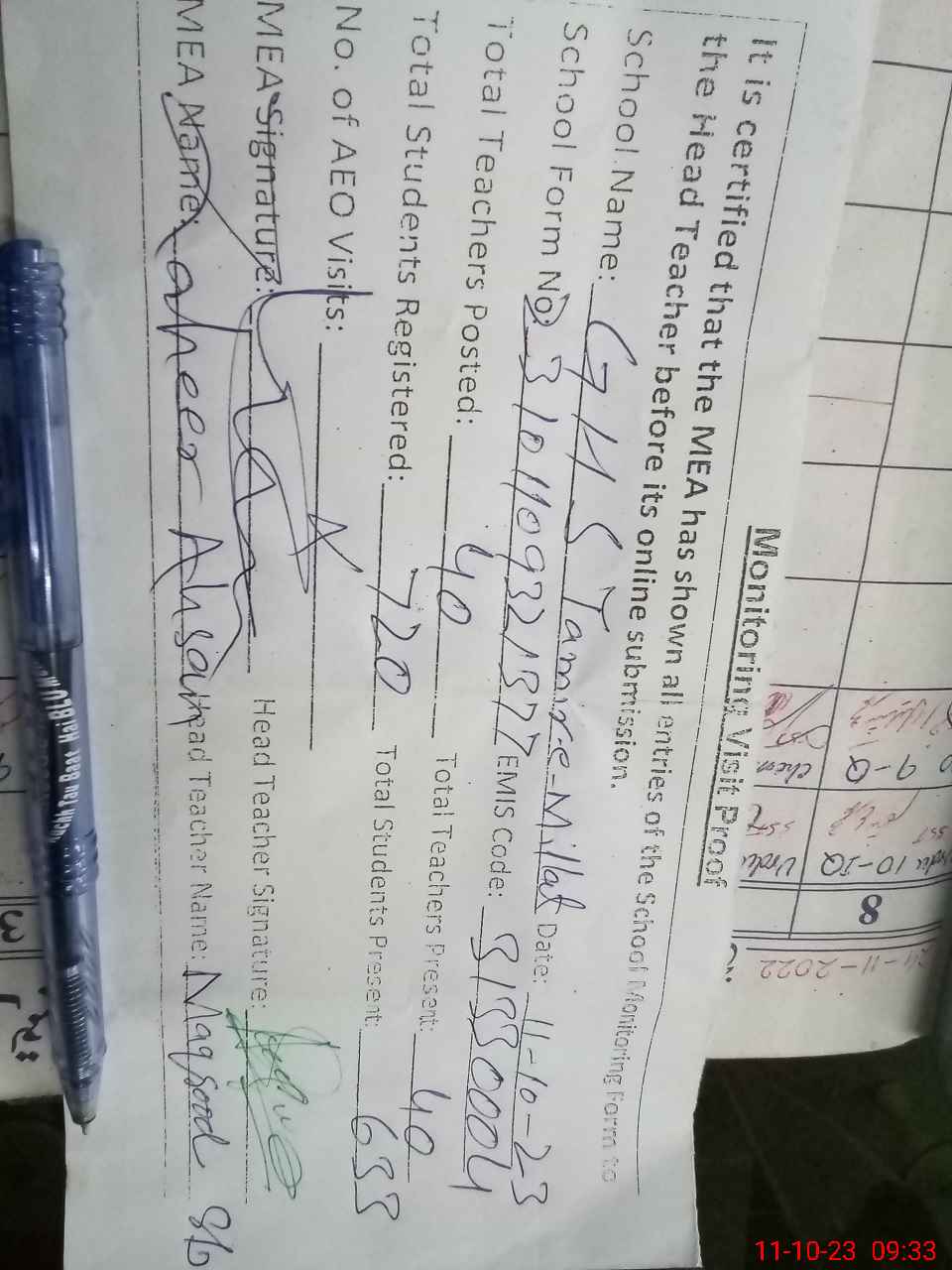 | Monitoring Date: 11-10-2023 | Start Time: 11-10-2023 08:04 AM | End Time: 11-10-2023 09:36 AM | Name of MEA: Za**** Ah**** | |