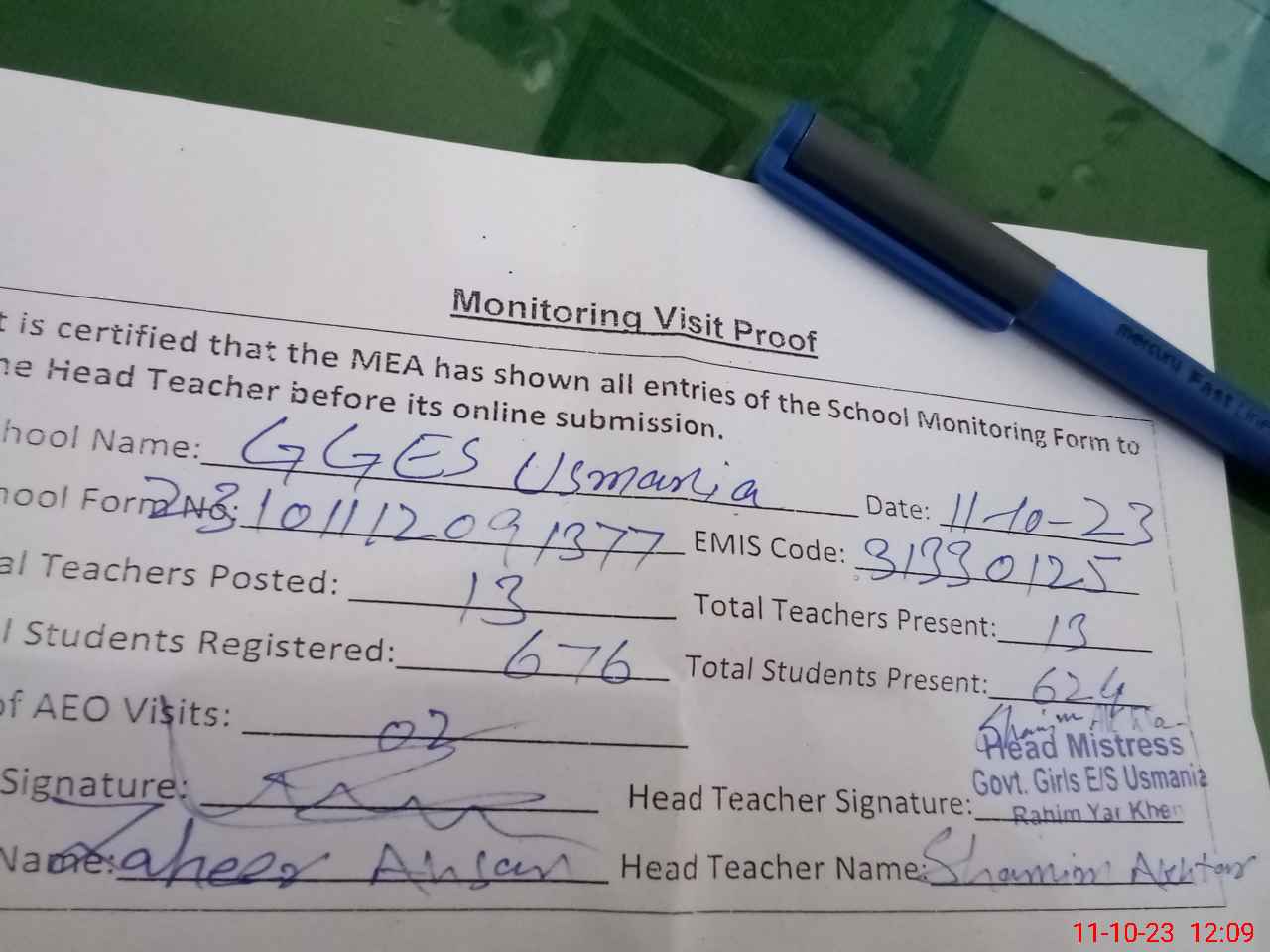 | Attendance Register | Head Teacher | MEA with School | Visit Proof |
