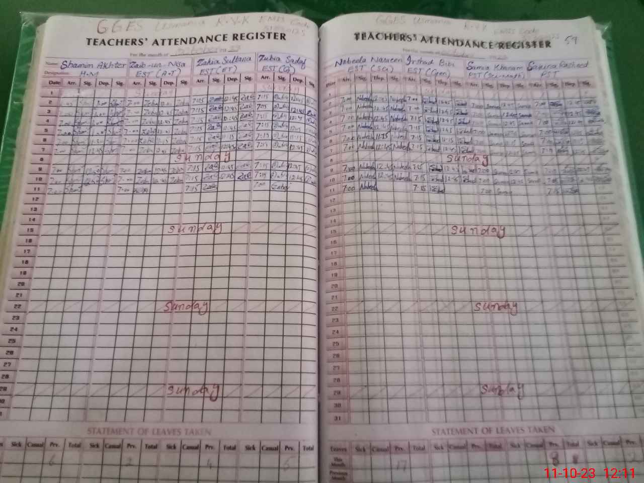| No. of Students Present - Female | 55 | 0 | 49 | 84 | 88 | 68 | 70 | 72 | 41 | 45 | 35 | 607 | ||||
