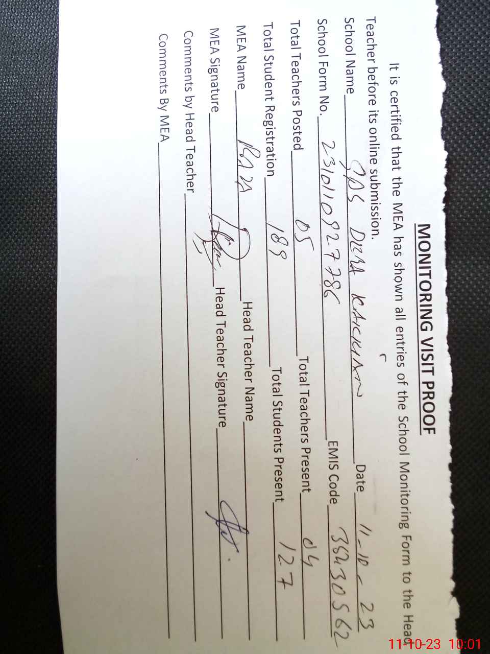 | Attendance Register | Head Teacher | MEA with School | Visit Proof |