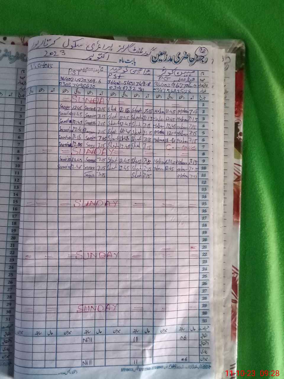 | Remarks (Use Separate Page if Required): PST Samina Saeed posted at GGSP 61SP but temporary duty at GGPS Kartar Pur without any official order White Boards are in poor condition needs to replace | |||||