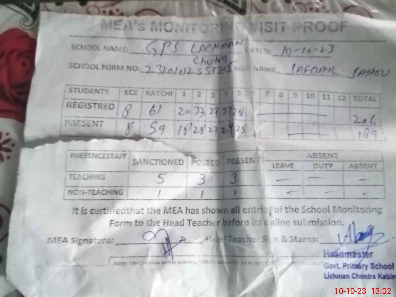 | Attendance Register | Head Teacher | MEA with School | Visit Proof |