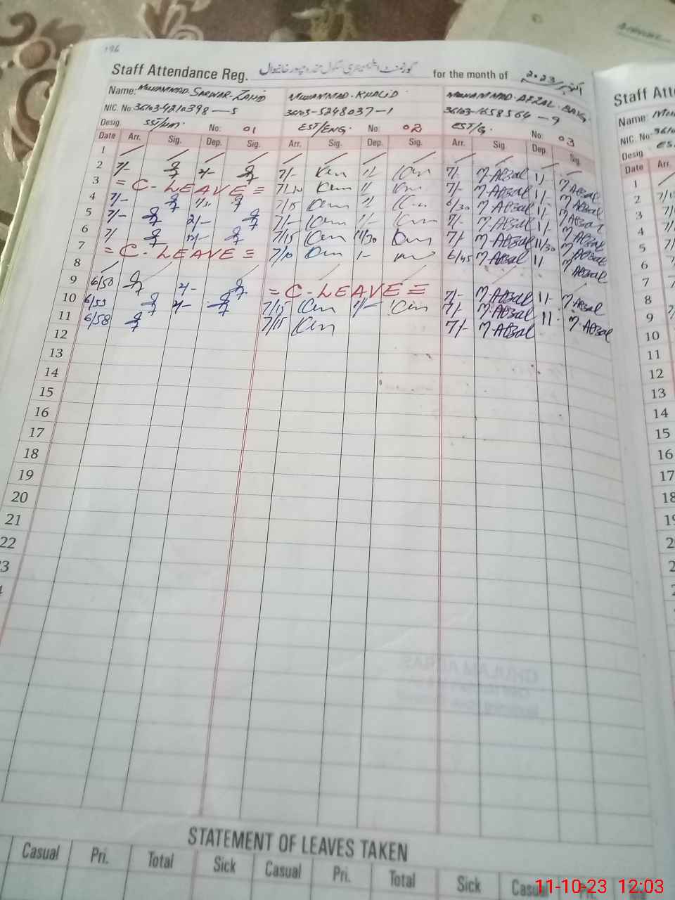 | CNIC | Full Name | Designation | R/C | Absence During Last Calender Month |