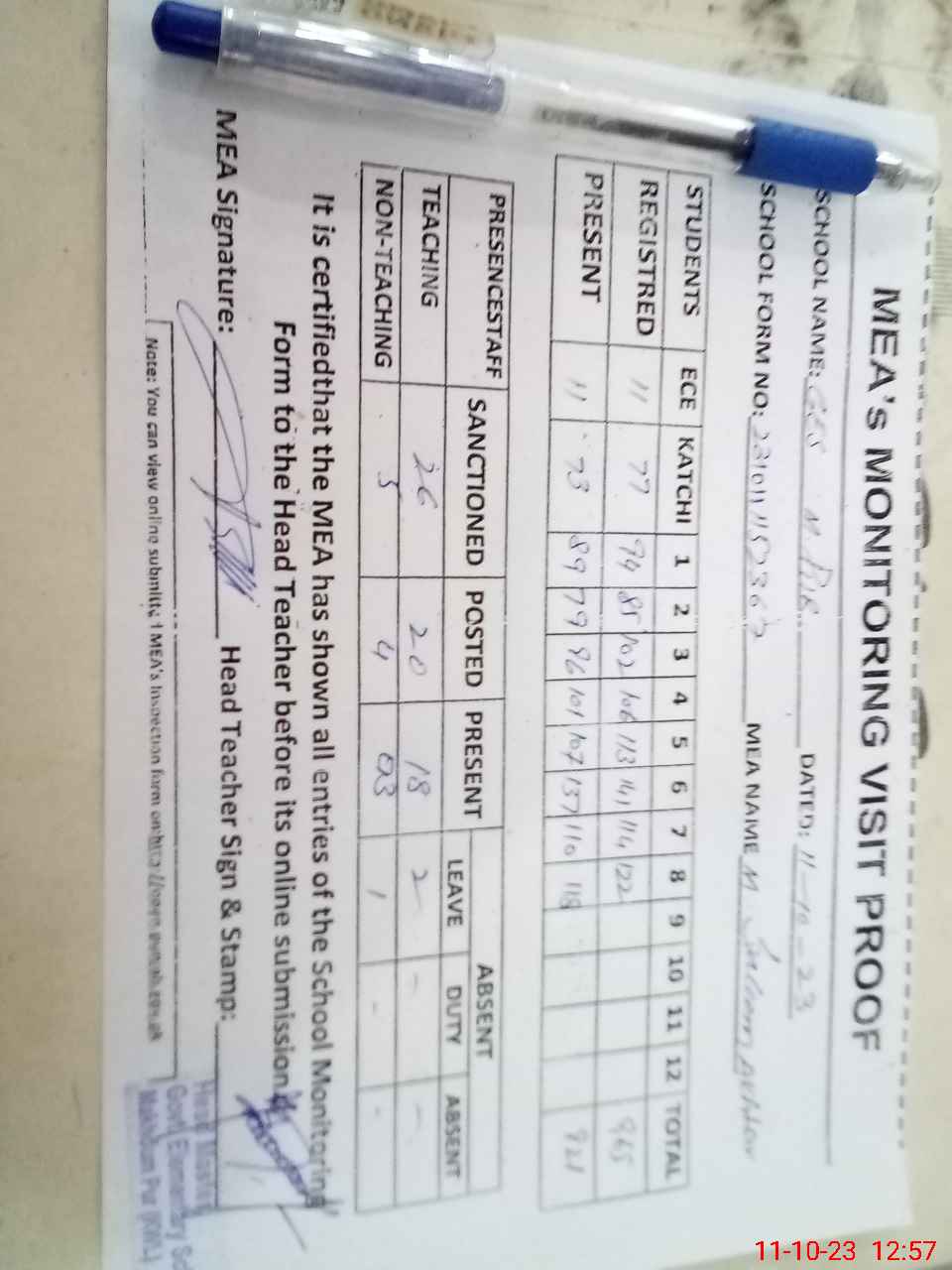 | Attendance Register | Head Teacher | MEA with School | Visit Proof |