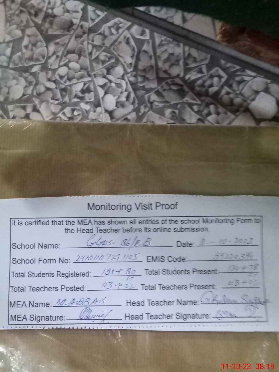 | Attendance Register | Head Teacher | MEA with School | Visit Proof |