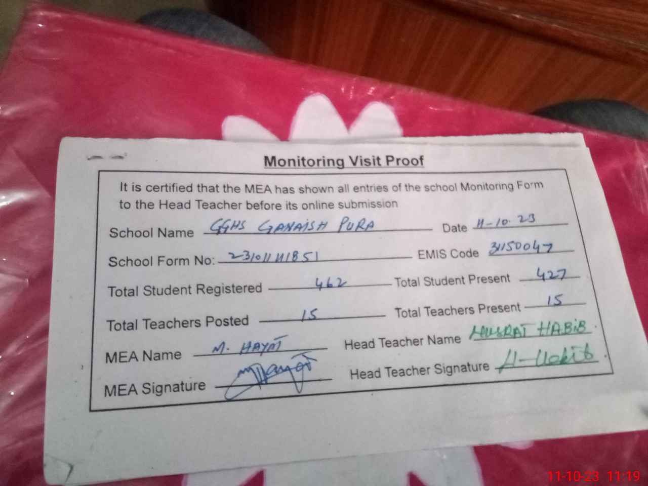 | EMIS Code: 31150047 | Name of School: GGHS GANESH PURA | |||