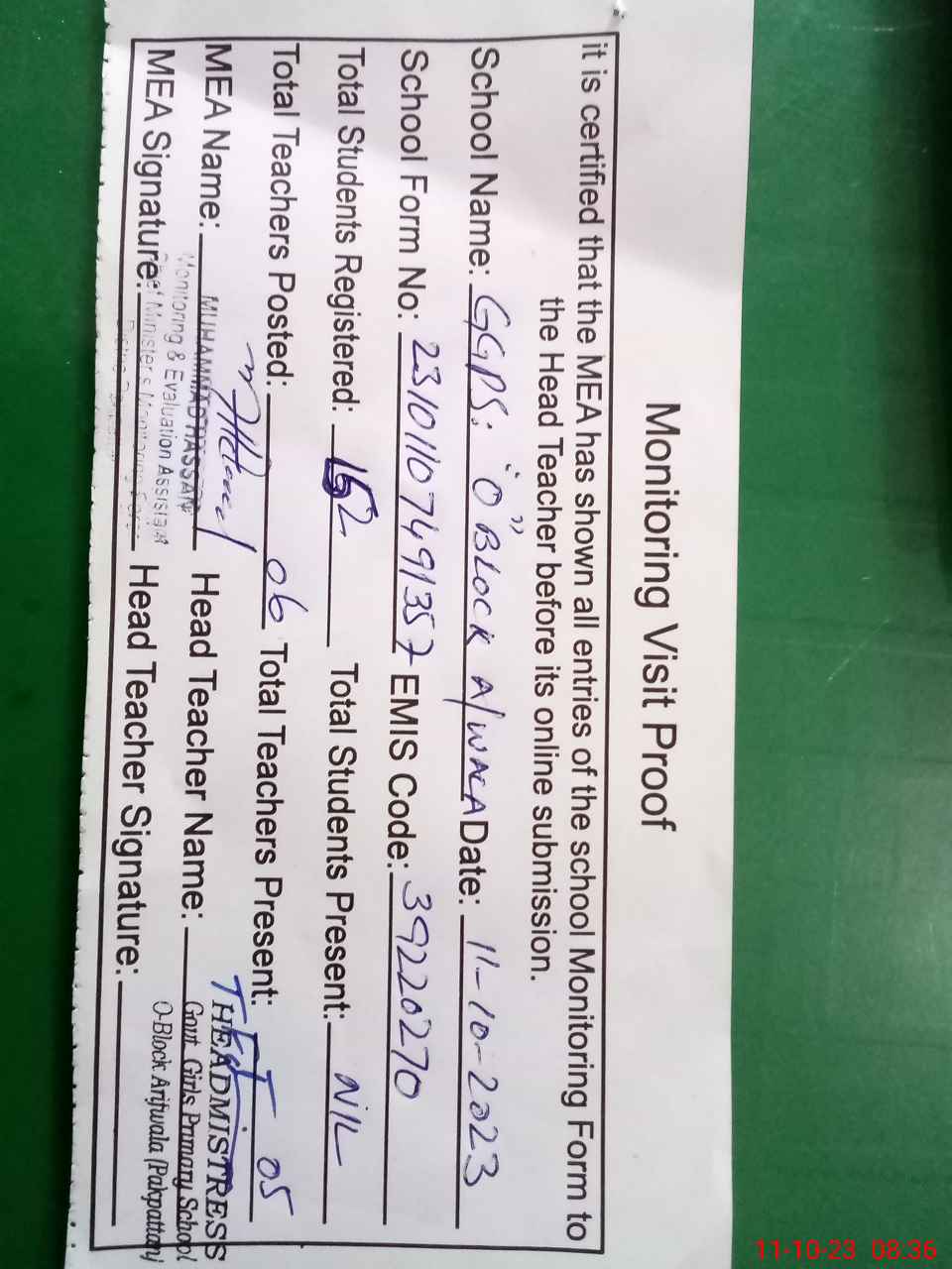 | Attendance Register | Head Teacher | MEA with School | Visit Proof |