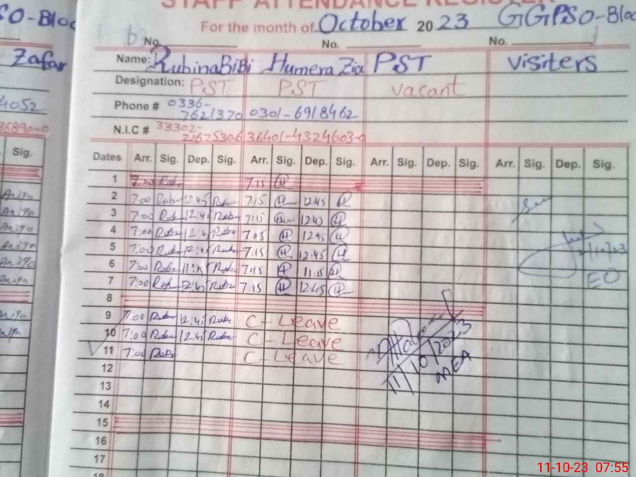 | Name: AZ**** PA**** Designation: (School Headmaster's/Headmistress's) PST Phone/Cell Number: 03**** |