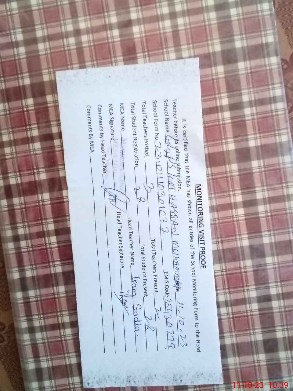 | Attendance Register | Head Teacher | MEA with School | Visit Proof |
