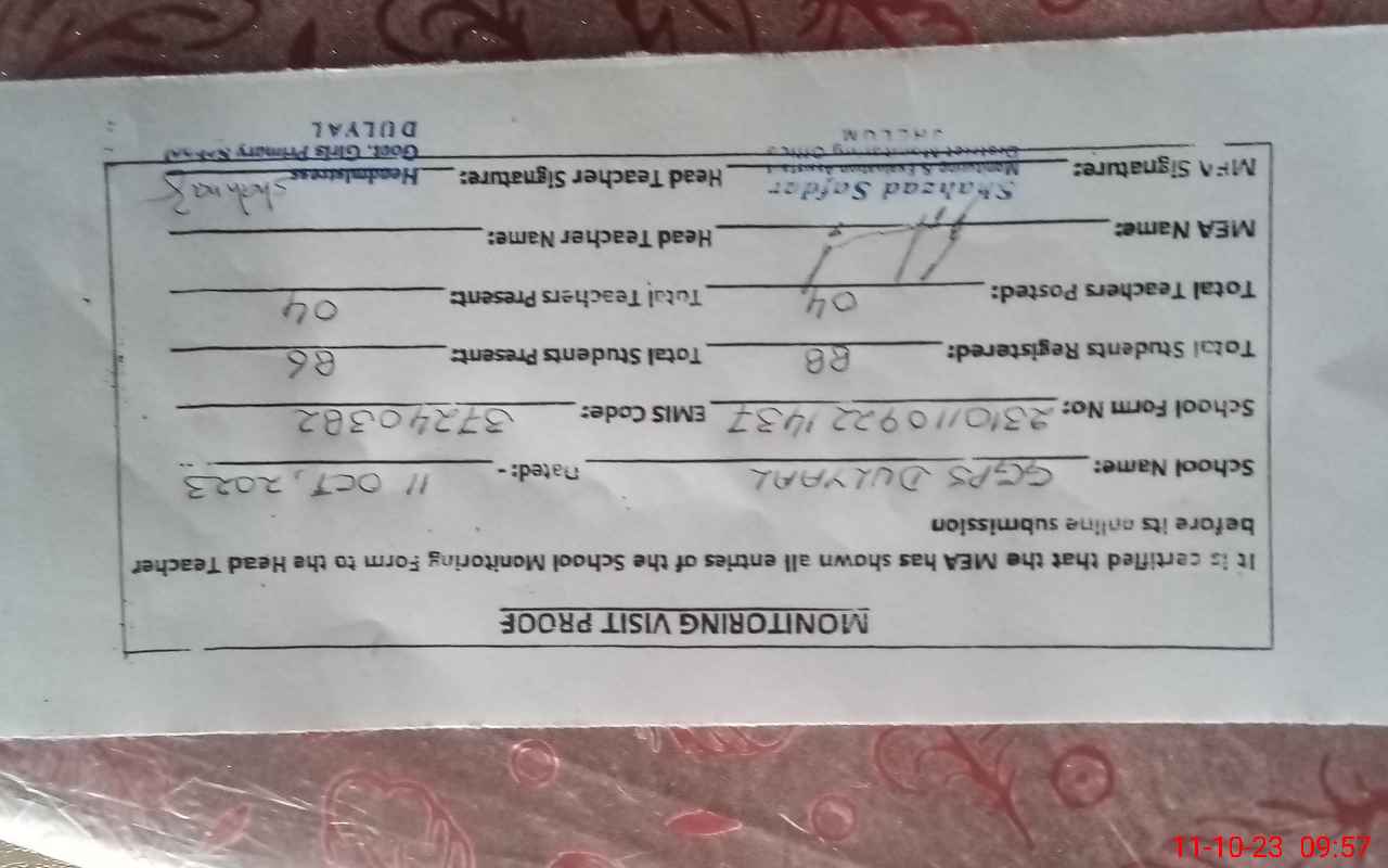 | Monitoring Date: 11-10-2023 | Start Time: 11-10-2023 09:22 AM | End Time: 11-10-2023 10:15 AM | Name of MEA: Sh**** Sa**** | |